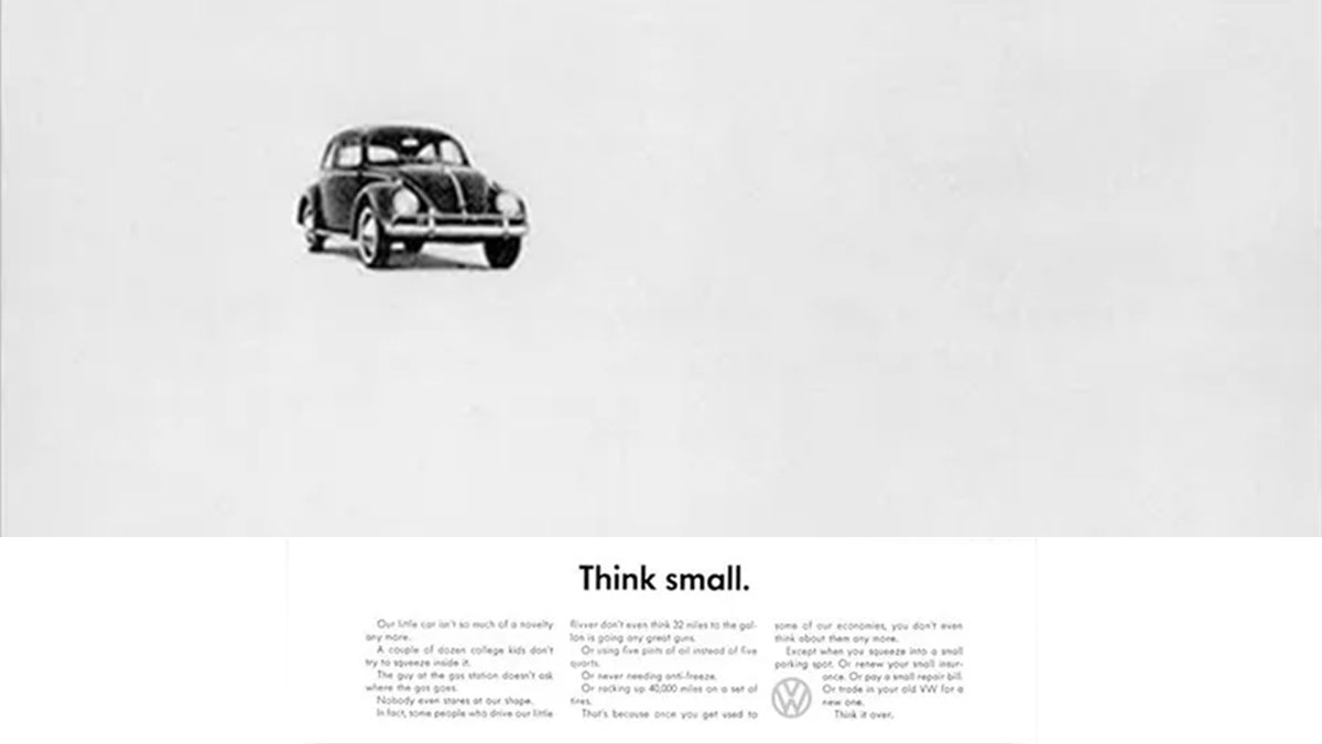 • Foolkswagen Beetle – Think Small ترکیب شعار کوتاه و تصویرسازی مینیمال که انقلابی در بازاریابی خودرو ایجاد کرد.